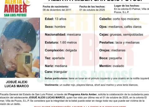 Autoridades de la Fiscalía General del Estado de San Luis Potosí (FGESLP), activaron una ficha de Alerta Amber para la localización de Josué Alexi Lucas Marco, de 13 años de edad, quien fue visto por última vez el 1 de octubre de 2025 en la colonia El Palmar, perteneciente al municipio de Villa de Pozos.