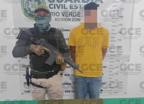 Como resultado de las acciones que se realizan en los 59 municipios de la entidad, elementos de la Guardia Civil Estatal lograron la detención de Jonathan "N" de 25 años, en la colonia Puente del Carmen, en el municipio de Rioverde.